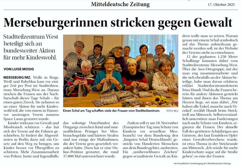 Frauen des Stadtteilzentrum Merseburg stricken den längsten Schal Deutschlands.